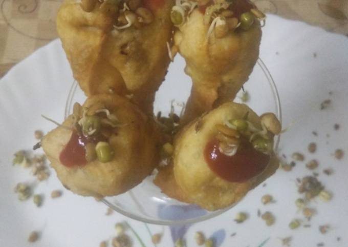 - Make dough using maida salt, water and 1/2tsp oil. Let dough rest for 15minutes. Mix green gram sprouts and horse gram sprouts, add cumin powder, pepper powder, salt, grated ginger, and lemon juice. Mix well, sprouts masala is ready. Keep it aside..